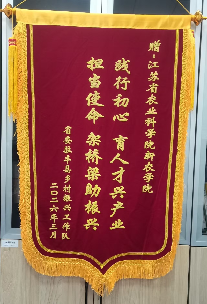 3月13日,江苏省农业科学院新农学院收到了来自省委驻丰县乡村振兴工作队的一封情真意切的感谢信和一面鲜艳的锦旗,“践行初心、育人才兴产业,担当使命、架桥梁助振兴”两行大字,饱含着对新农学院过去一年付出的肯定。